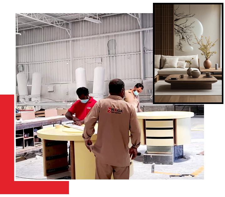 Indiga Solid Surface places a strong emphasis on quality, precision, and complex project execution. The company works closely with leading architects and designers to bring creative concepts to life. Its operations are supported by a state-of-the-art 3,600 square meter manufacturing facility, equipped with advanced machinery and managed by a team of highly experienced engineers and professionals.