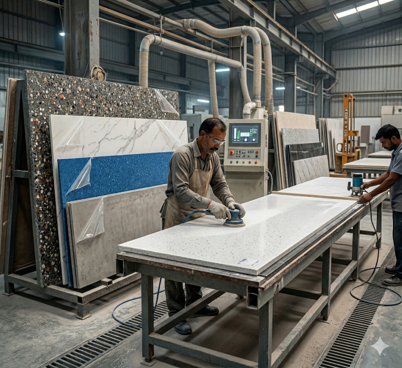 Indiga Stone Technical Services LLC specializes in the precision fabrication of solid surface materials for a wide range of commercial, hospitality, healthcare, and residential applications. With advanced fabrication facilities and experienced craftsmen, we transform raw solid surface sheets into customized products that meet the specific design and technical requirements of each project.